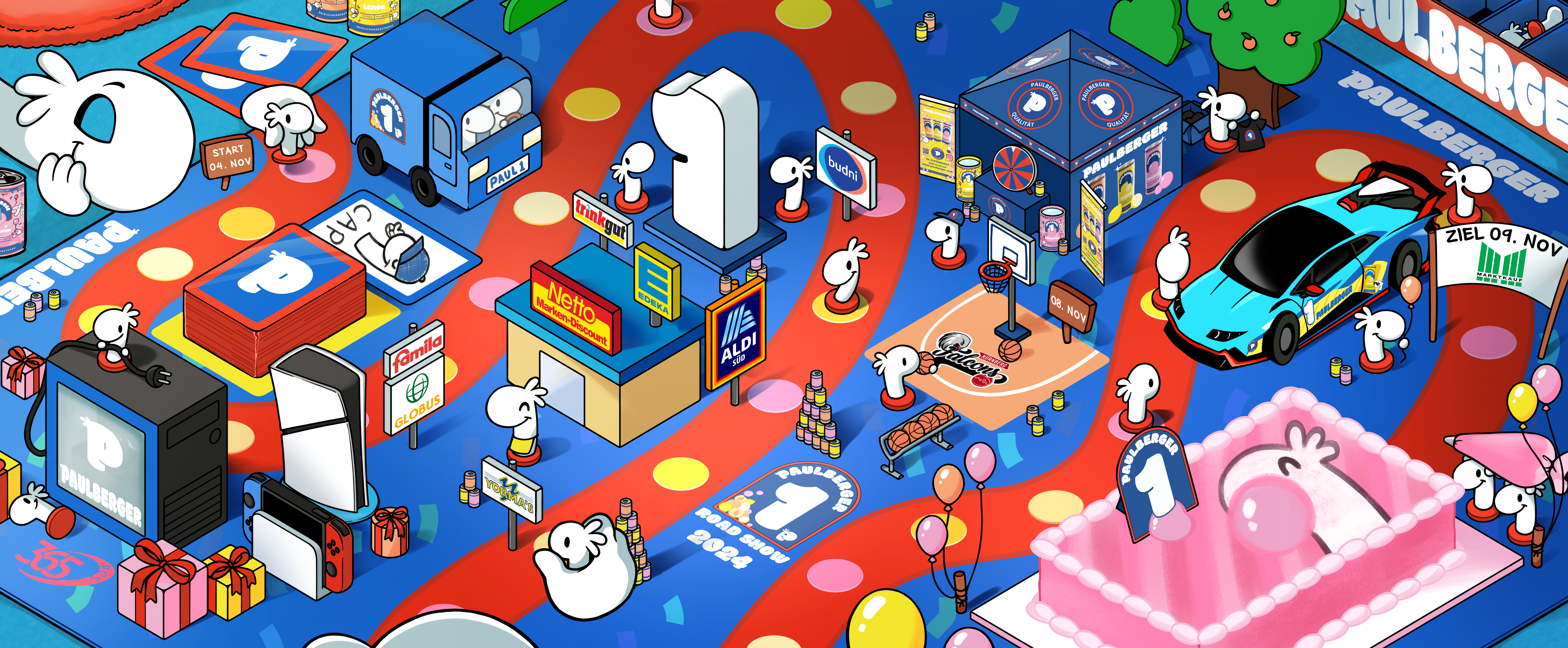 Zur Feier des PAULBERGER Jubiläums erscheinen alle drei Geschmacksrichtungen in einer streng limitierten SONDEREDITION. Die Paulchens feiern den einjährigen Geburtstag der PAULBERGER Limo und schmeißen deshalb eine große Party. BUBBLEGUM, PEACH und LEMON glänzen in individuellem Jubiläums-Design. Da dürfen Ballons, Konfetti und Wimpel natürlich nicht fehlen! Die Jubiläumsdose wird exklusiv in Deutschlands Supermärkten verkauft. (EDEKA, Netto, trinkgut, ALDI Süd, Yorma's, famila, Budni)